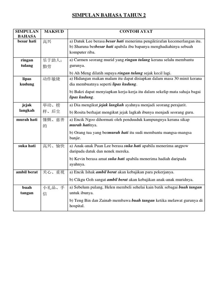 Contohnya, anak buah ,buah tangan, lipas. Laman web ini menyediakan koleksi peribahasa melayu yang sesuai untuk pelajar sekolah yang akan mengambil peperiksaan akhir tahun, ujian upsr, pt3, spm atau stpm di mata pelajaran bahasa malaysia. Simpulan bahasa yang berlainan tetapi mempunyai maksud yang sama.contohnya seseorang yang tidak mempunyai malu muka talam ,muka tebal ,muka tembok seseorang yang telah lanjut usianya tetapi perangai tidak senonoh tua keladi ,tua kutuk,tua lengkuas bentuk dan ciri 1.t erbentuk daripada penggunaan kata am.